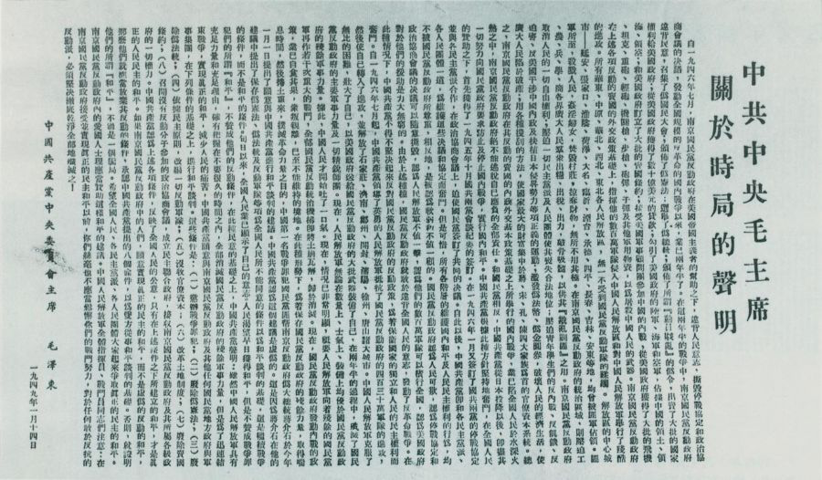 毛澤東以中共中央主席名義發表《關于時局的聲明》。聲明指出:南京國民黨反動政府,在其反動的賣國的內政外交基本政策的基礎之上所舉行的國內戰爭,業已陷全國人民于水深火熱之中,南京國民黨反動政府決不能逃脫自己應負的全部責任。但是,為了迅速結束戰爭,實現真正的和平,減少人民的痛苦,中國共產黨愿意和南京國民黨反動政府及其他任何國民黨地方政府和軍事集團,在下列條件的基礎之上進行和平談判。這些條件是:(一)懲辦戰爭罪犯;(二)廢除偽憲法;(三)廢除偽法統;(四)依據民主原則改編一切反動軍隊;(五)沒收官僚資本;(六)改革土地制度;(七)廢除賣國條約;(八)召開沒有反動分子參加的政治協商會議,成立民主聯合政府,接收南京國民黨反動政府及其所屬各級政府的一切權力。上述各項條件反映了全國人民的公意,只有在上述各項條件之下所建立的和平,才是真正的民主的和平。聲明還要求中國人民解放軍全體指戰員,在國民黨反動政府接受并實現真正的民主的和平以前,絲毫也不應當松懈自己的戰斗努力。對于任何敢于反抗的反動派,必須堅決、徹底、干凈、全部地殲滅之。這個聲明收入《毛澤東選集》第四卷。