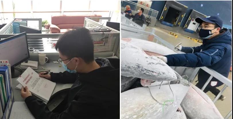疫情爆發之時正值海上漁業生產旺季,加納超低溫回運貨柜增加,面對繁重的漁獲卸載任務,年輕黨員姜寅生沖鋒在前,帶領卸貨職工吹響復工復產“集結號”。