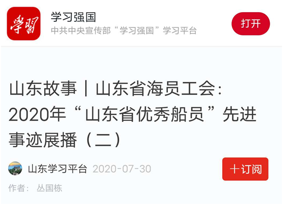 今天你“學習強國”了嗎?“學習強國”里的山東故事你看了嗎?2020年山東省優秀船員你知道都有誰嗎?咦,我們的船員在里面,對,他就是張勝剛!
