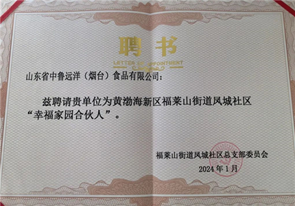 近日,煙臺市福萊山街道鳳城社區黨總支為中魯食品公司頒發“幸福家園合伙人”聘書,雙方將進一步深化黨員互動、活動互聯、資源共享、經驗共鑒、共...
