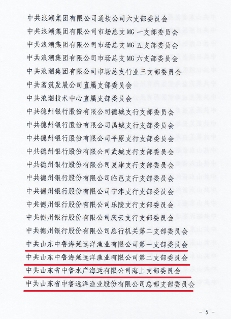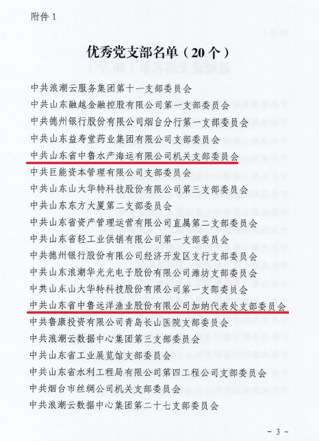 近日,山東國投公司黨委公布第二批優秀黨支部、過硬黨支部名單。中魯海運機關黨支部、加納代表處黨支部被評為“優秀黨支部”,中魯海延第一黨支部、第二黨支部,中魯海運海上黨支部和總部黨支部被評為“過硬黨支部”。截止目前,中魯遠洋公司過硬黨支部達90%以上。