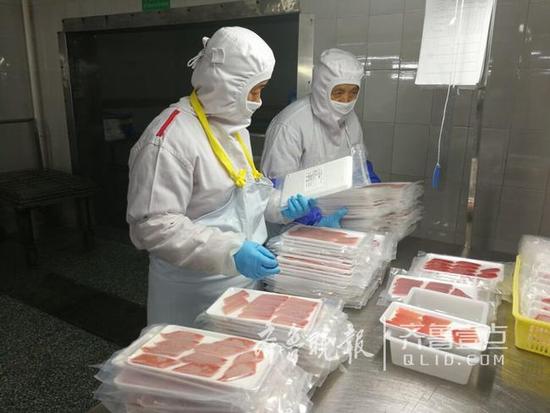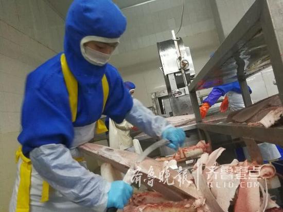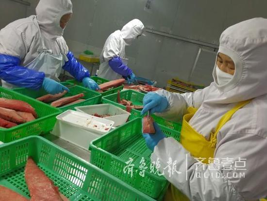 11日上午,在山東省中魯遠(yuǎn)洋(煙臺(tái))食品有限公司的加工車間,工人們在緊張而有序 的忙碌著,一條條超低溫冷凍的金槍魚被經(jīng)過去頭、去皮、去刺、切斷、切片、稱重...... 一系列的加工流程之后,一盒盒的美味佳肴、金槍魚生魚片出爐了,并出口到日本、歐洲等 各國。
