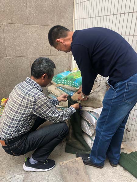 會后,物業管理部購買了新的防汛專用沙袋,將過去陳舊破損的沙袋重新裝袋更換,黨員同志們分為三組,在三處重點防汛區域拿起鐵锨、掃帚等工具擼起袖子開始勞動。雖然裝沙袋的時候塵土飛揚嗆鼻,但是同志們全然不顧,有的裝袋,有的扎口,很快一排排新的沙袋整齊有序地擺放在不同的防汛專用口,之后大家又拿起工具把院落的垃圾死角清掃干凈,現場一派熱火朝天的勞動場面。