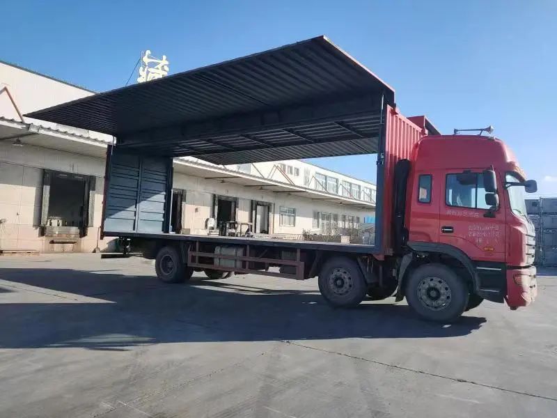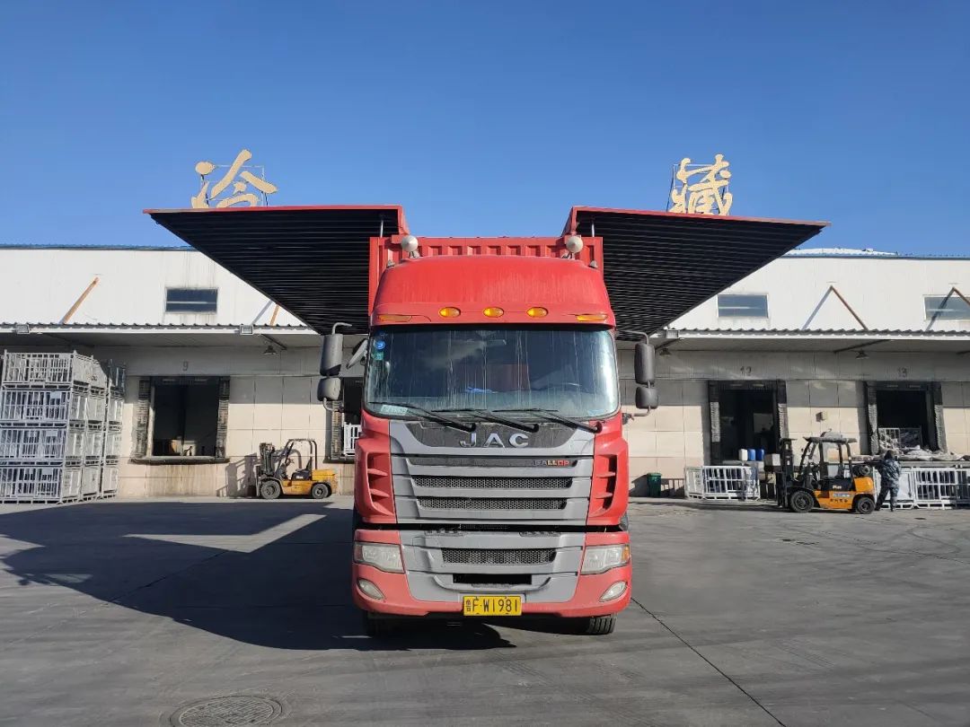 前衛(wèi)的外觀,讓顏值與實(shí)力擔(dān)當(dāng)“雙高”。“貨車不再‘傻大黑粗’,而且實(shí)現(xiàn)了‘個(gè)性定制’,真是刷新了我對(duì)貨車的刻板印象。”看著駛出公司大門的裝運(yùn)貨車,一位裝柜工感慨地說(shuō)。為實(shí)現(xiàn)快速裝卸,中魯冷藏多方調(diào)研,深入探討、運(yùn)作改造方案,“定制貨車”最終采用可兩側(cè)同時(shí)雙開(kāi)門的“飛機(jī)展翼”改造式樣,兩側(cè)廂門可最大程度抬高至平行于車頂位置,從而保障運(yùn)輸裝卸的安全、高效,獨(dú)特新穎的外觀在顏值與實(shí)力上有了“雙高”的加分項(xiàng)。